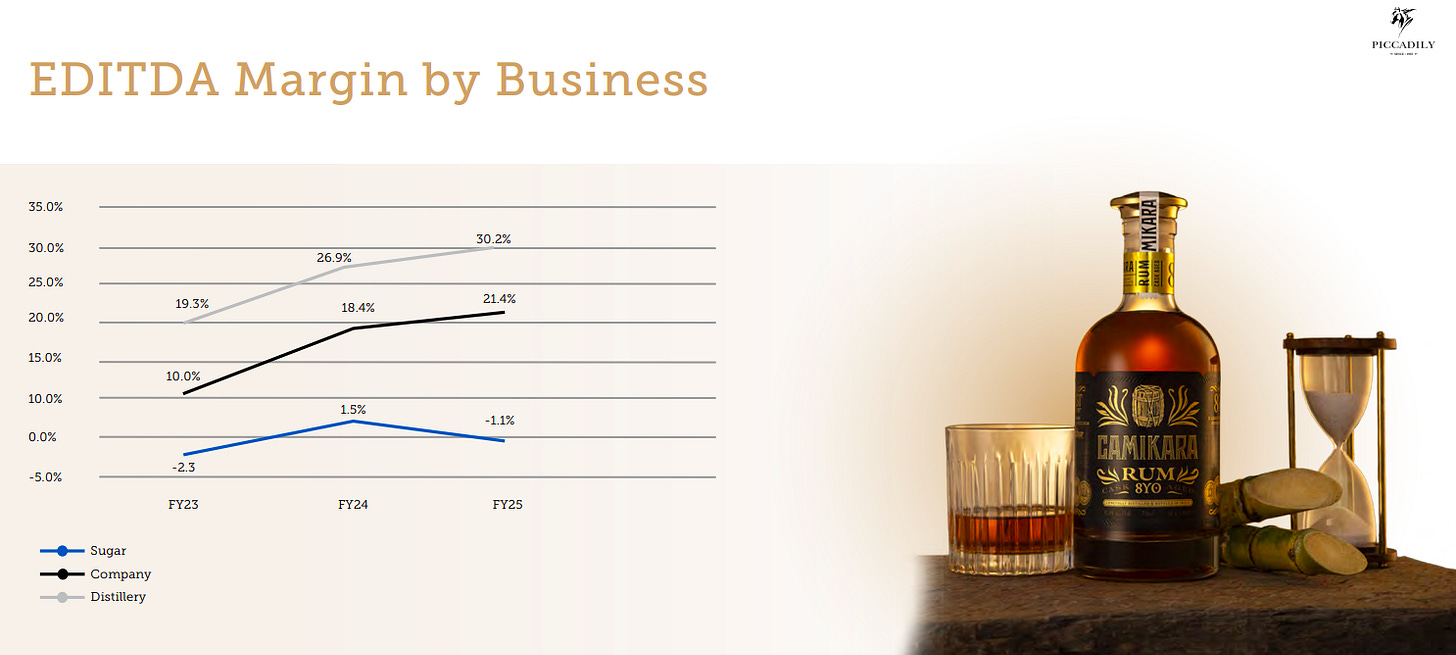 Piccadily’s company EBITDA margin improved to 21.4% in FY25, driven by distillery margins rising to 30.2%, while sugar margins stayed weak at -1.1%.
