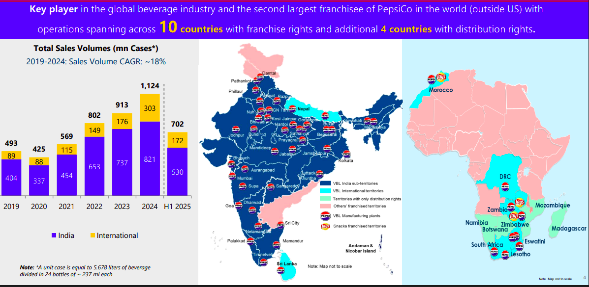 Varun Beverages, PepsiCo’s 2nd largest global franchisee, operates across 10 countries with rights in 4 more, offering a wide portfolio spanning Pepsi, Tropicana, Gatorade, Aquafina, and its own brands like Refreshh & Cream Bell. Sales volumes grew at an ~18% CAGR (2019–24), reaching 1.12 bn cases in 2024, with India driving bulk volumes and expanding presence across Africa and South Asia.