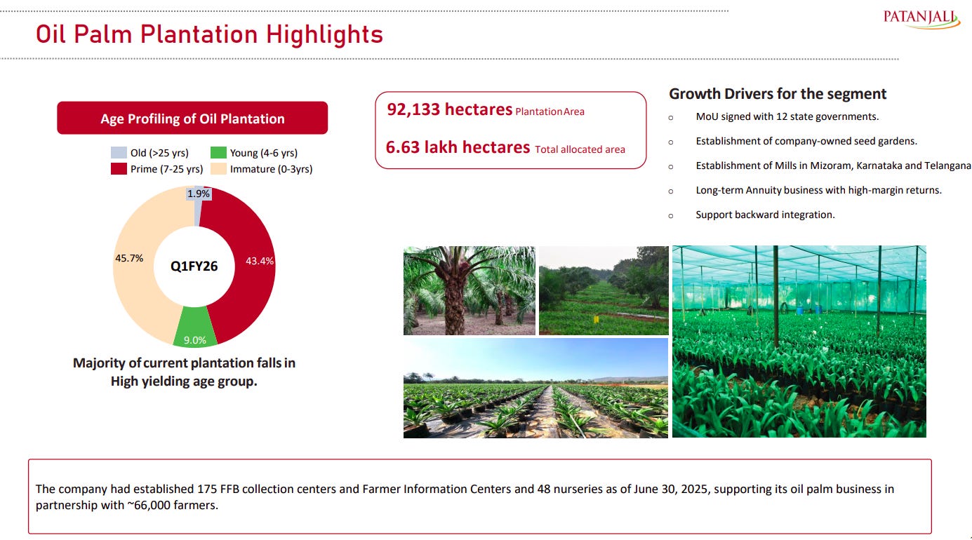Patanjali operates oil palm plantations across 92,133 hectares, with 6.63 lakh hectares of total allocated land. The company works with around 66,000 farmers through 175 collection centers and 48 nurseries. Currently, 43.4% of their plantations are 7-25 years old, which is the most productive age range for oil palm trees. They have signed agreements with 12 state governments and established processing mills in Karnataka and Telangana to support their expansion plans.