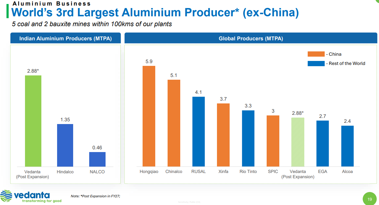 At 2.88 MTPA capacity by FY27, Vedanta will be more than double its nearest Indian competitor Hindalco (1.35 MTPA), giving it pricing power domestically.