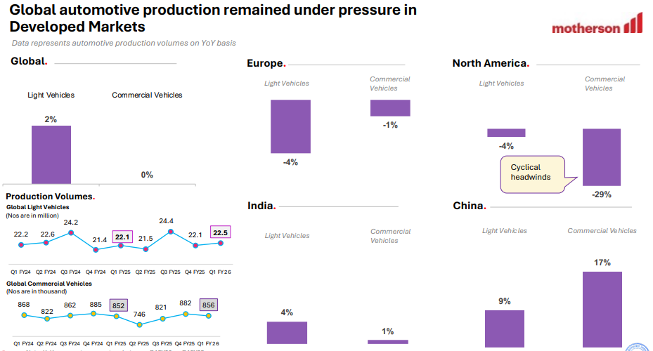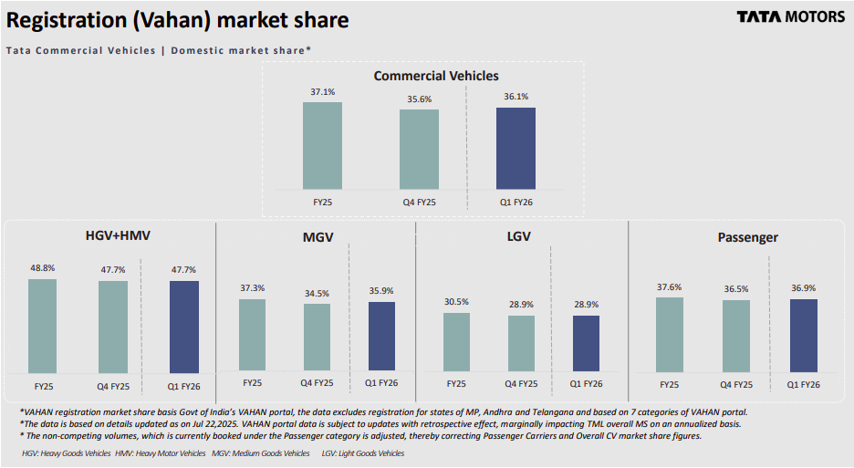 Tata Motors' domestic market share shows interesting trends across categories. In Commercial Vehicles, share slipped from 37.1% in FY25 to 35.6% in Q4 FY25, before recovering to 36.1% in Q1 FY26. HGV+HMV remained steady at ~47.7–48.8%, while MGV dipped from 37.3% to 34.5% but rebounded to 35.9%. LGV weakened from 30.5% to 28.9%, whereas the Passenger segment stayed stable at ~36.5–36.9%. Strength in heavy vehicles contrasts with pressure in medium and light segments.