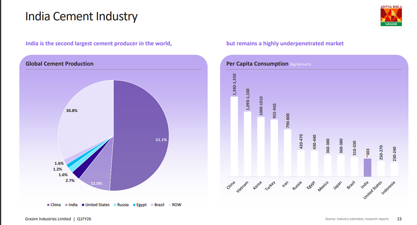 India is the 2nd largest cement producer globally (11% share) but remains underpenetrated, with per capita consumption at ~303 kg, far below China (>1,300 kg) and global peers.