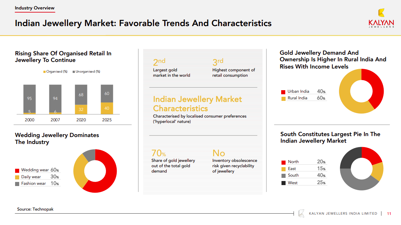 The Indian jewellery market is the 2nd largest gold market globally and ranks 3rd in retail consumption. Organised retail is steadily rising, projected to reach 40% by 2025, while wedding jewellery remains dominant at 60% of demand. Gold demand is stronger in rural India (60%) than urban (40%), and the South leads regionally with 40% share. With gold forming 70% of overall jewellery demand and being recyclable, the industry faces no risk of inventory obsolescence.