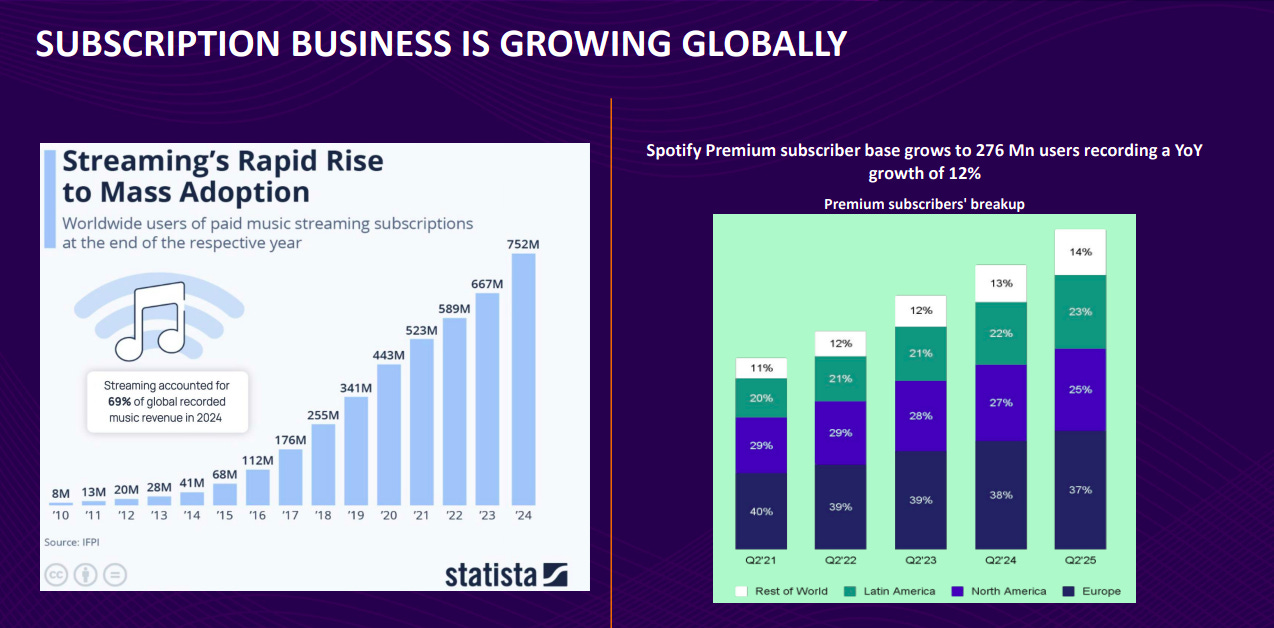 Global paid music streaming subscriptions surged to 752M in 2024, now driving 69% of industry revenue; Spotify premium users hit 276M (+12% YoY) with growth across all regions.