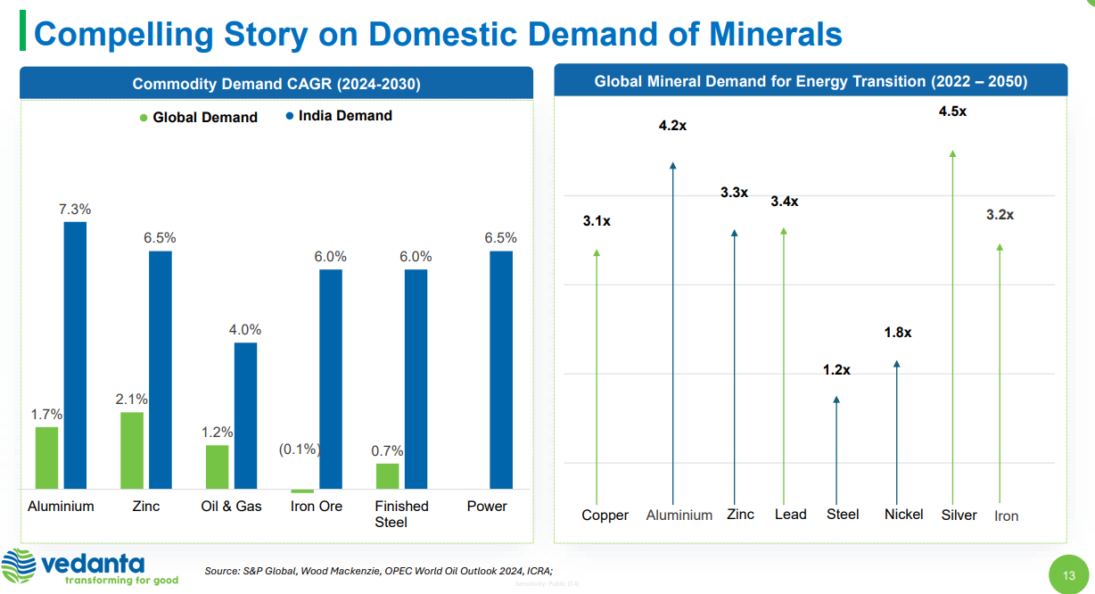 The slide reveals Vedanta's positioning at the intersection of two powerful demand drivers: India's commodity consumption growing at 3-5x the global rate (with aluminium at 7.3% vs 1.7% globally, zinc at 6.5% vs 2.1%, and finished steel at 6% vs 0.7% CAGR through 2030), while simultaneously, the global energy transition will multiply demand for these same metals by 3-4.5x by 2050, driven by electric vehicles, renewable energy infrastructure, and grid modernization.