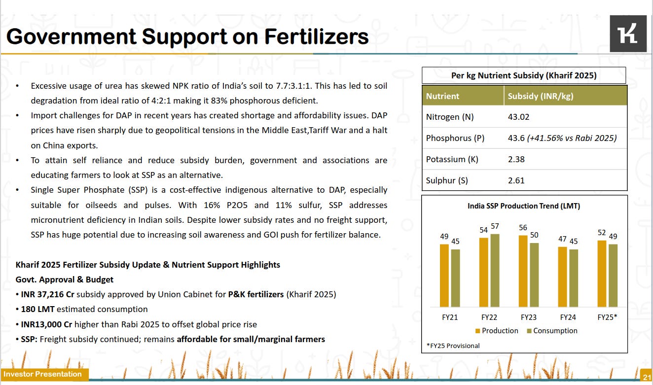Heavy urea use has distorted India’s soil NPK ratio to 7.7:3.1:1, creating severe phosphorus deficiency. DAP affordability is under pressure due to geopolitical tensions and China’s export curbs, pushing the government to promote SSP as a cost-effective, indigenous alternative for oilseeds and pulses. For Kharif 2025, the government approved a ₹37,216 Cr subsidy for P&K fertilizers with 180 LMT estimated consumption, including a ₹13,000 Cr buffer against global price spikes. SSP remains subsidized for freight and affordable for small/marginal farmers, with production and consumption steady at ~50 LMT.