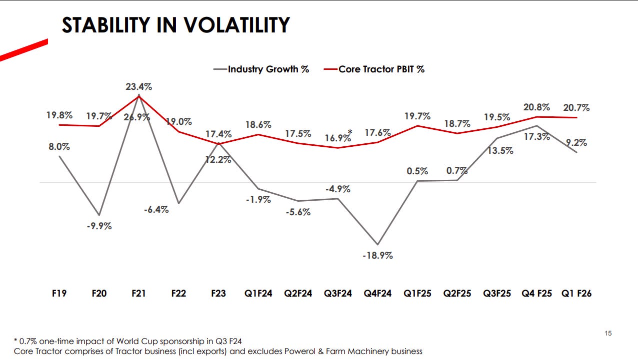 Despite industry swings, M&M’s core tractor PBIT stayed resilient at ~20.7% in Q1 FY26, highlighting strong margin stability versus sector volatility.