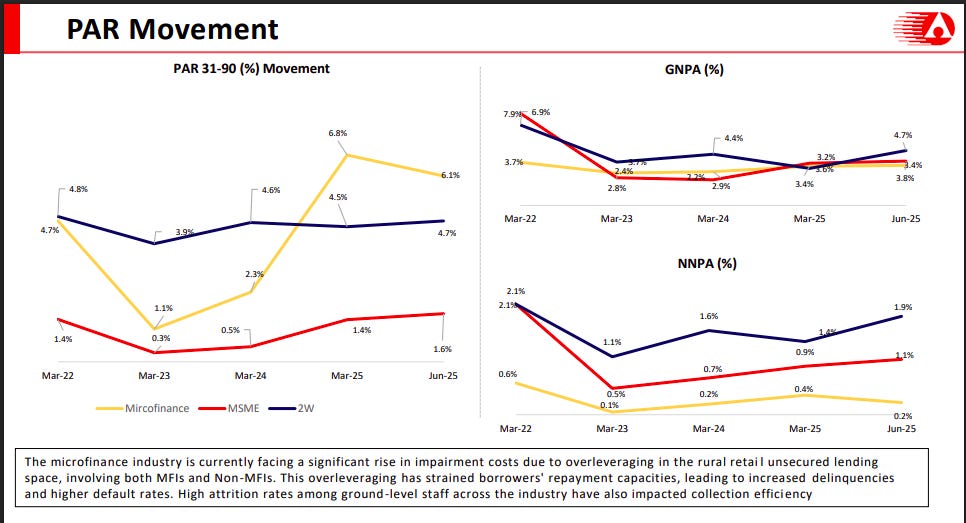 Arman’s asset quality shows stress in Microfinance PAR 31–90, rising to 6.1% in Jun-25 vs 0.3% in Mar-23, while MSME (1.6%) and 2W (4.7%) remain relatively stable. GNPA stands at 4.7%, NNPA at 1.9%, highlighting pressure from rural overleveraging and weaker repayment capacity.