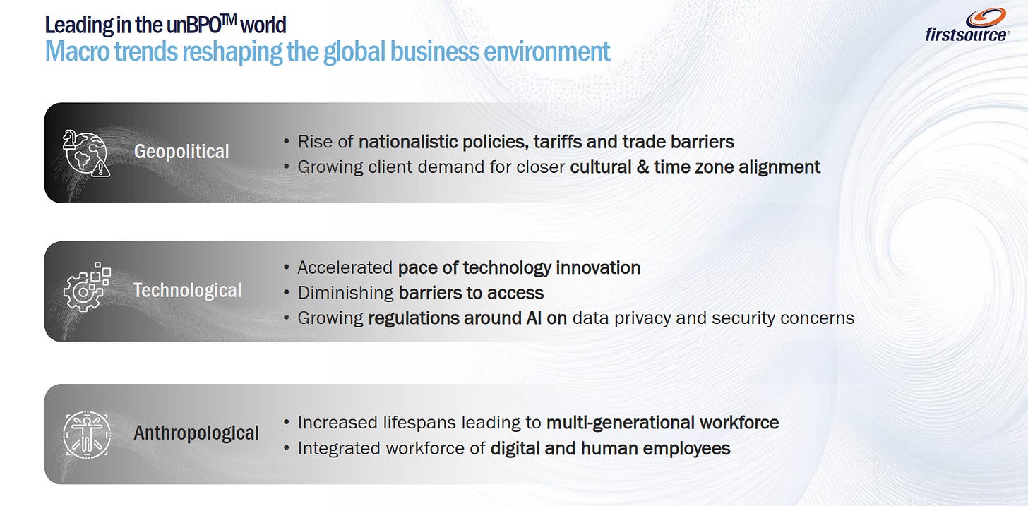 The global business environment is being reshaped by three macro trends. Geopolitically, rising nationalism, tariffs, and trade barriers are driving demand for closer cultural and time zone alignment. Technologically, rapid innovation is reducing access barriers but increasing regulatory focus on AI, data privacy, and security. Anthropologically, longer lifespans are creating multi-generational workforces with deeper integration of digital and human employees.