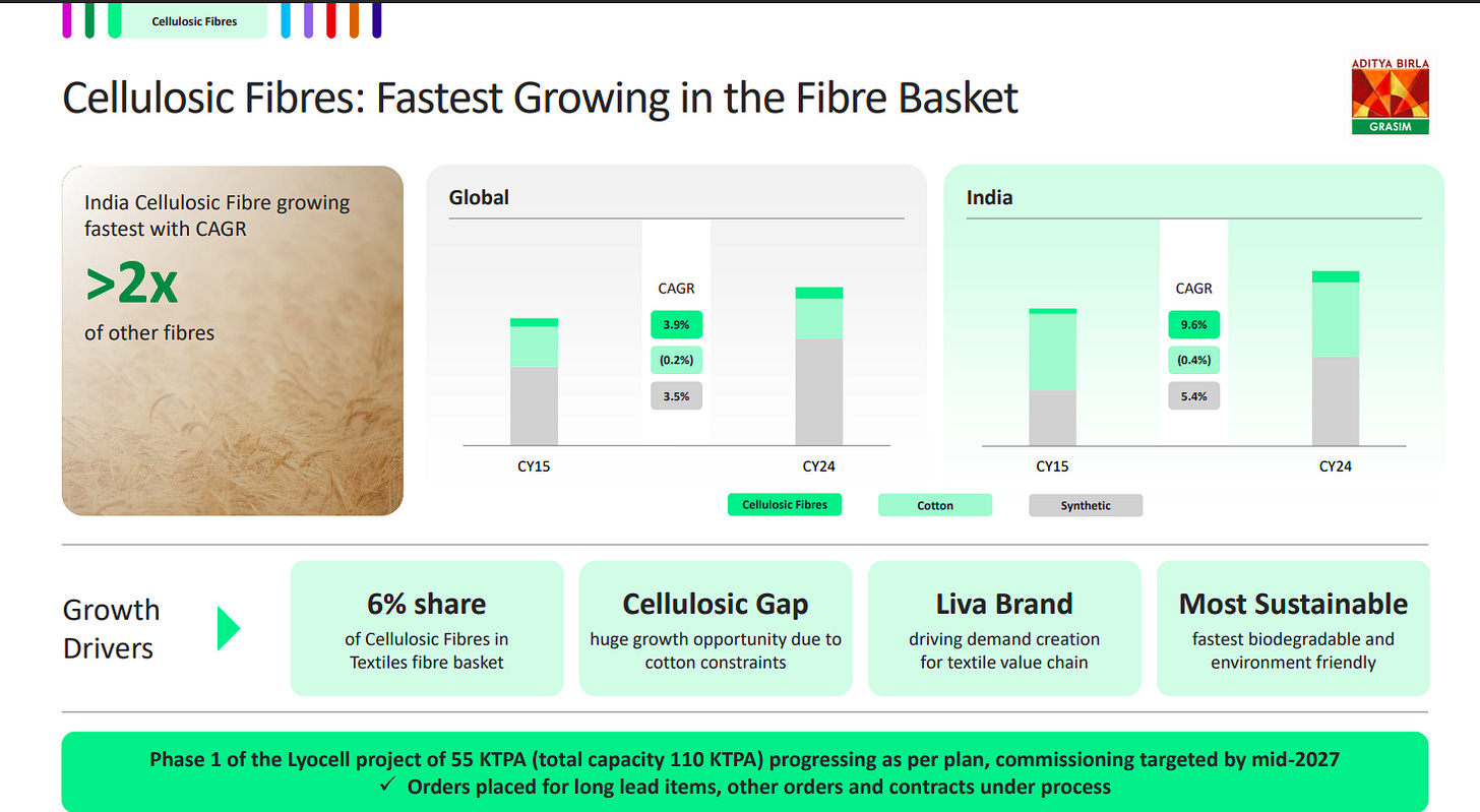 India’s cellulosic fibre demand is growing at >2x other fibres, with a 9.6% CAGR (CY15–24), driven by cotton supply constraints, Liva brand-led demand, and sustainability benefits.