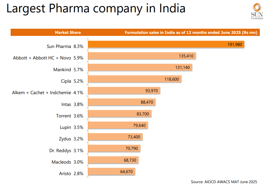 Sun Pharma leads India’s pharmaceutical market with an 8.3% share and ₹191,980 mn in formulation sales (as of June 2025), ahead of Abbott (5.9%), Mankind (5.7%), and Cipla (5.2%). Alkem, Intas, Torrent, Lupin, and Zydus follow in the mid-tier, while Dr. Reddy’s, Macleods, and Aristo round out the top 10 with 3%–3.1% share each.