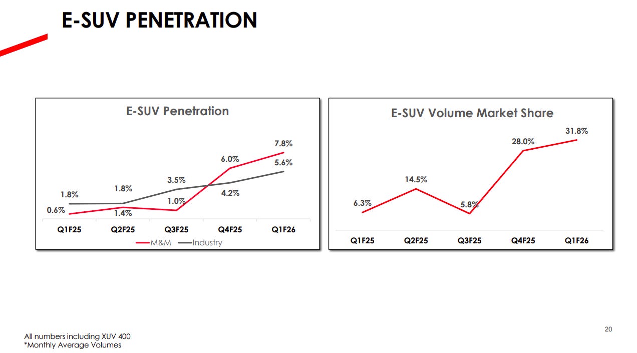 M&M’s E-SUV penetration surged to 7.8% in Q1 FY26, ahead of industry’s 5.6%, while its E-SUV volume market share hit 31.8%, up sharply from 6.3% a year ago.