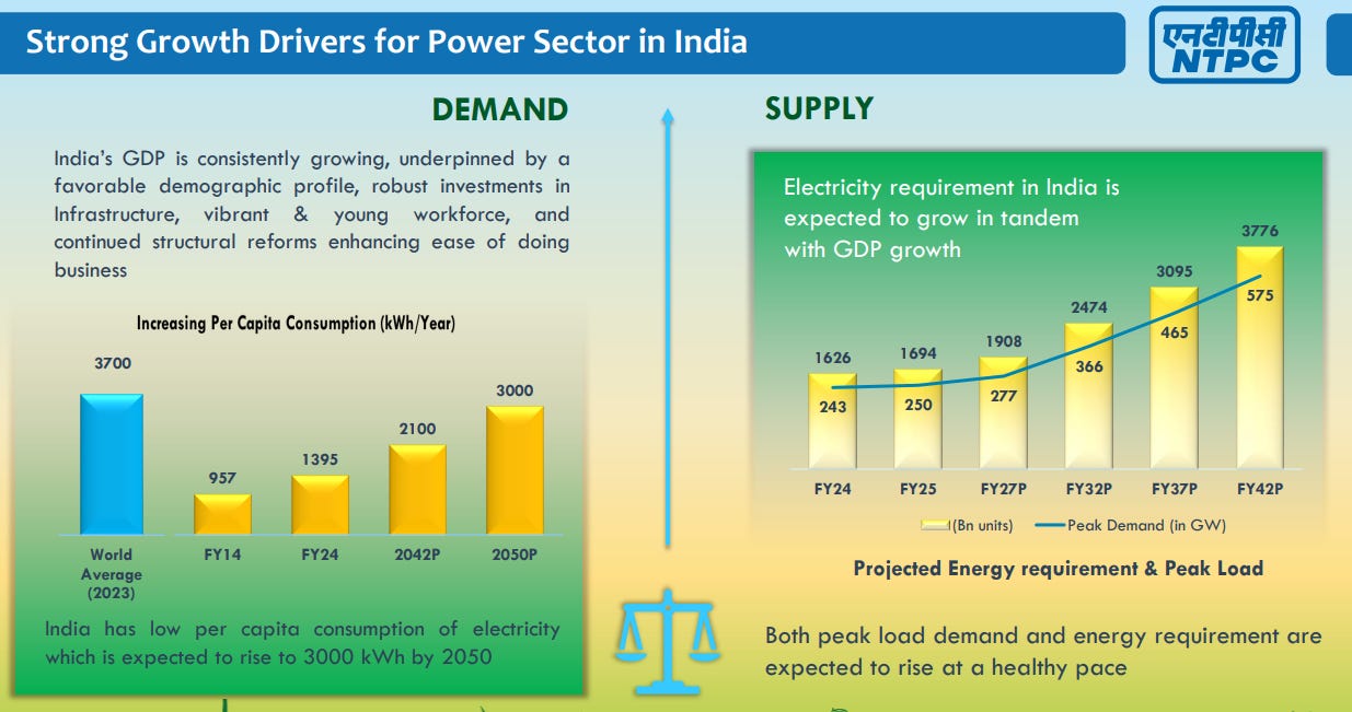 NTPC, India's largest integrated power company, focuses on delivering reliable, affordable, and sustainable electricity to the nation through thermal, hydro, solar, and wind power plants. Committed to best practices and clean energy, NTPC also explores new ventures like e-mobility, battery storage, waste-to-energy, green hydrogen solutions, and power distribution.