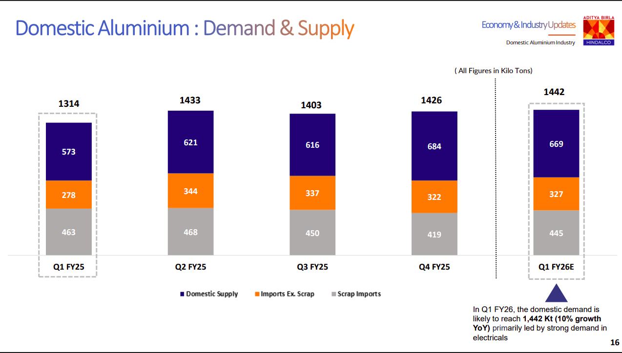 India’s domestic aluminium demand is expected to reach 1,442 KT in Q1 FY26 (10% YoY growth), driven by strong demand in electricals.