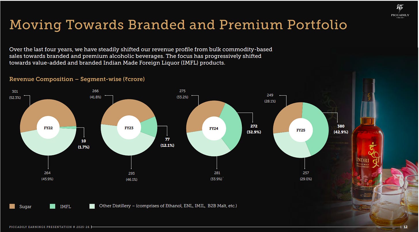 Revenue composition has steadily shifted towards premium beverages, with IMFL share rising to 42.9% in FY25, while sugar declined to 28.1% and distillery (ethanol, ENL, malt, etc.) formed 29%.