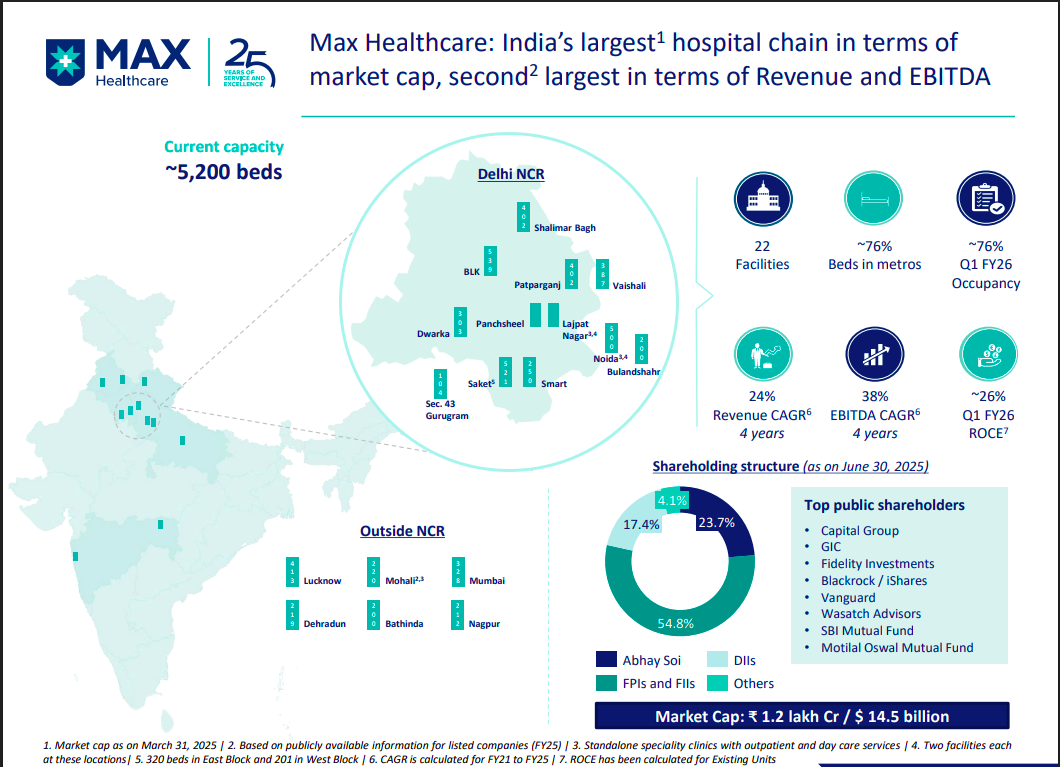 Max Healthcare, India’s largest hospital chain by market cap and second largest by revenue & EBITDA, operates 22 facilities with ~5,200 beds (76% in metros) and reported 76% occupancy in Q1 FY26. Over the last 4 years, it has delivered 24% revenue CAGR, 38% EBITDA CAGR, and ~26% ROCE, with strong shareholder backing from global funds like Capital Group, GIC, Fidelity, and BlackRock.