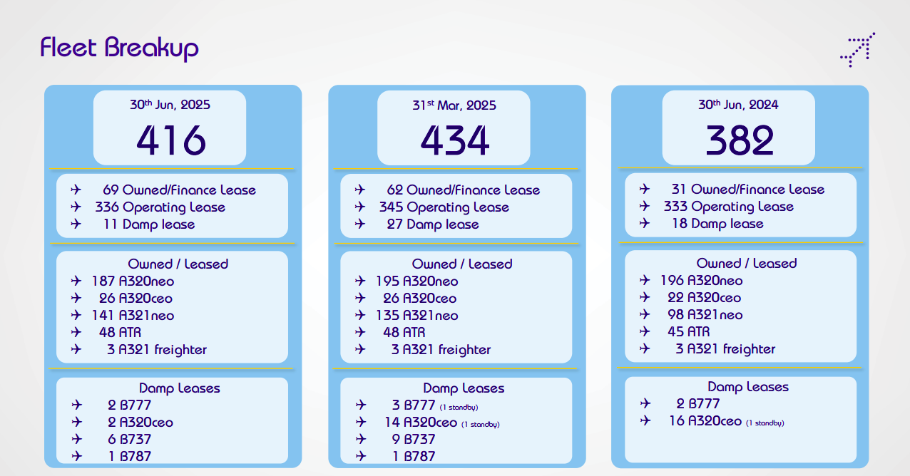 IndiGo’s fleet rose to 416 aircraft by June 30, 2025, up from 382 a year earlier, though slightly down from 434 in March 2025. The mix includes 187 A320neo, 141 A321neo, 26 A320ceo, 48 ATRs, and 3 A321 freighters, alongside 11 damp leases. The share of owned/finance leases increased to 69, while operating leases remained dominant at 336. Damp leases included widebody aircraft like B777s and B787s along with B737s and A320ceos.
