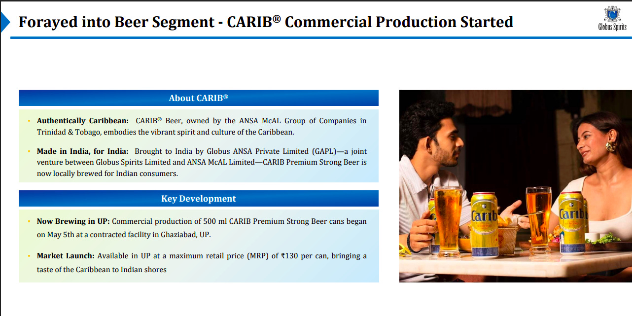 Globus Spirits forays into the beer market with CARIB Premium Strong Beer, brewed in UP via a JV with ANSA McAL, priced at ₹130 per can to bring Caribbean flavours to Indian consumers.