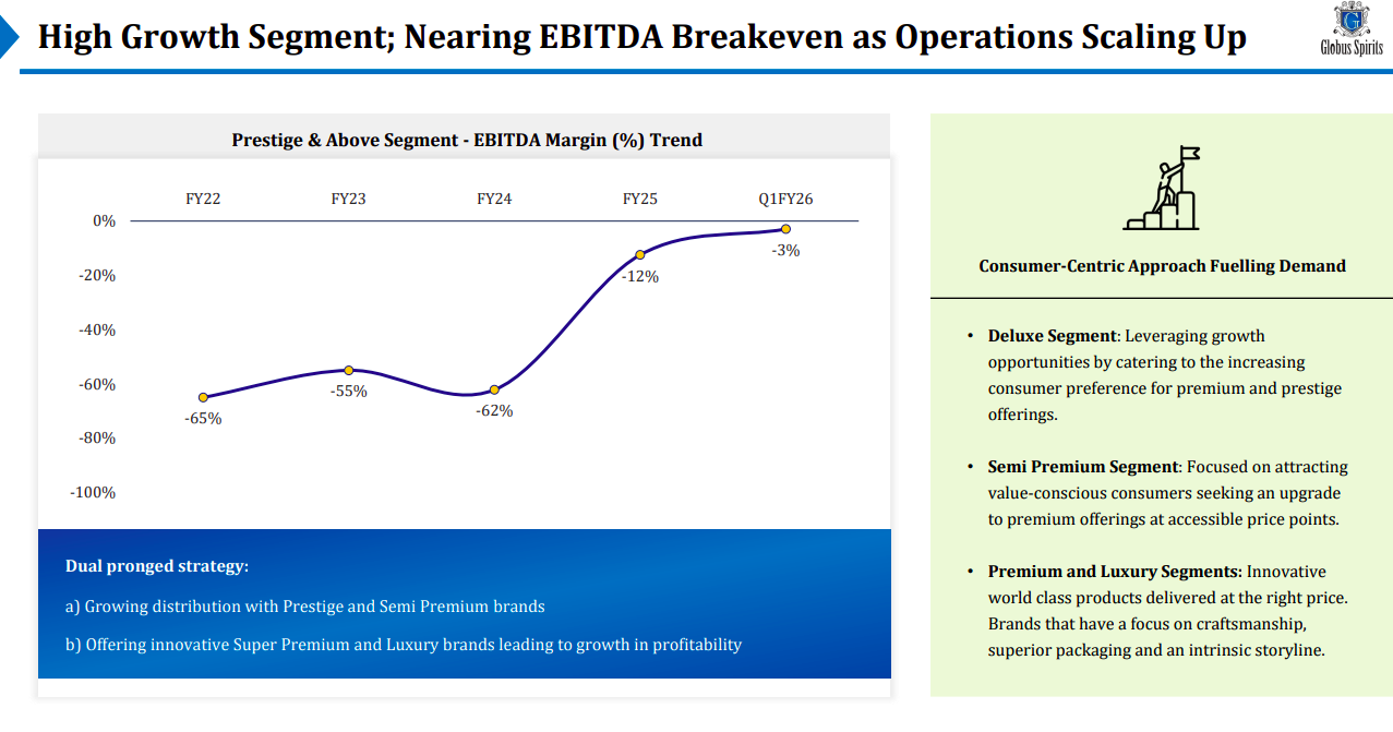 Globus Spirits’ prestige & above segment has improved margins from -65% in FY22 to -3% in Q1 FY26, nearing breakeven, backed by a dual strategy of expanding semi-premium/premium reach and launching innovative super-premium brands.