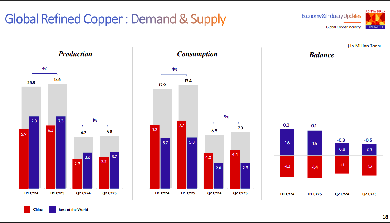 Global refined copper production grew 3% YoY in H1 CY25, but consumption rose faster at 4%, keeping the market nearly balanced with only 0.1 MT surplus.
