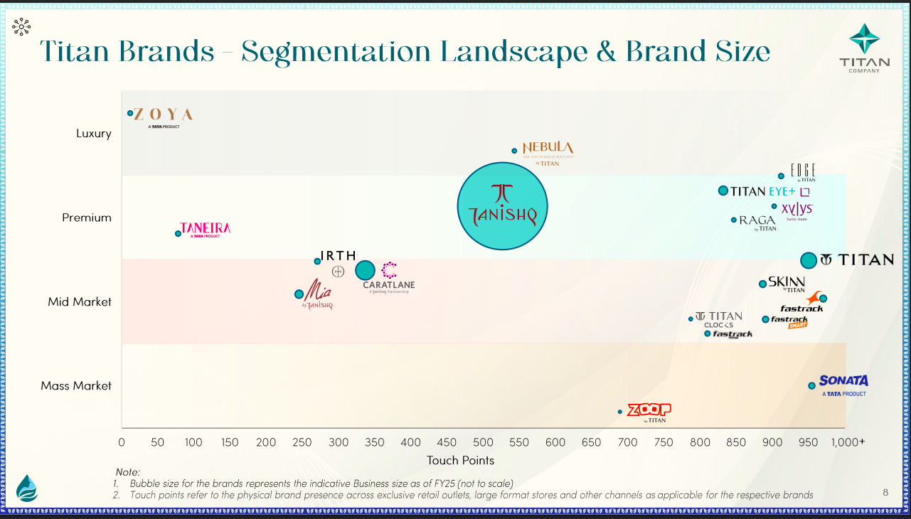 Titan’s brand portfolio spans across Luxury (Zoya), Premium (Tanishq, Nebula, Taneira, CaratLane, Titan Eye+, Raga, Xylys, Edge), Mid-Market (Mia, IRTH), and Mass-Market (Titan, Fastrack, Skinn, Sonata, Zoop), with Tanishq as the flagship brand and Sonata leading in reach with 1,000+ touchpoints.