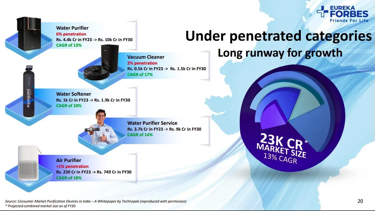 Eureka Forbes operates in several home appliance categories with low market penetration rates, indicating significant growth potential. Water purifiers have only 6% penetration despite growing from Rs. 4.4k Cr to Rs. 10k Cr (13% CAGR). Vacuum cleaners show just 2% penetration with the smallest market size of Rs. 0.5k Cr expanding to Rs. 1.5k Cr (17% CAGR). Air purifiers have less than 1% penetration but represent the fastest-growing segment at 18% CAGR, from Rs. 230 Cr to Rs. 749 Cr. The company also offers water softeners and purifier services, with the total addressable market projected to reach 23k Cr by FY30 at 13% CAGR.