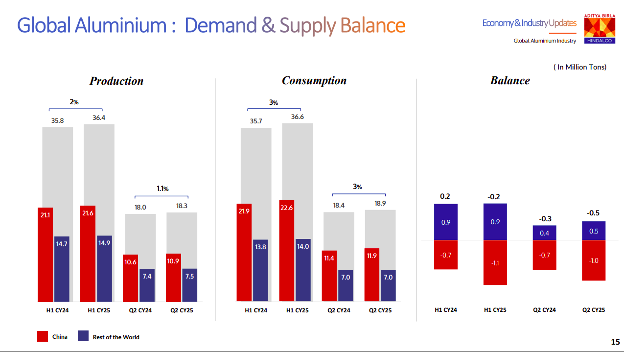Global aluminium production rose 2% in H1 CY25, but consumption grew 3%, leading to a 0.2–0.5 MT deficit, mainly due to higher Chinese demand.