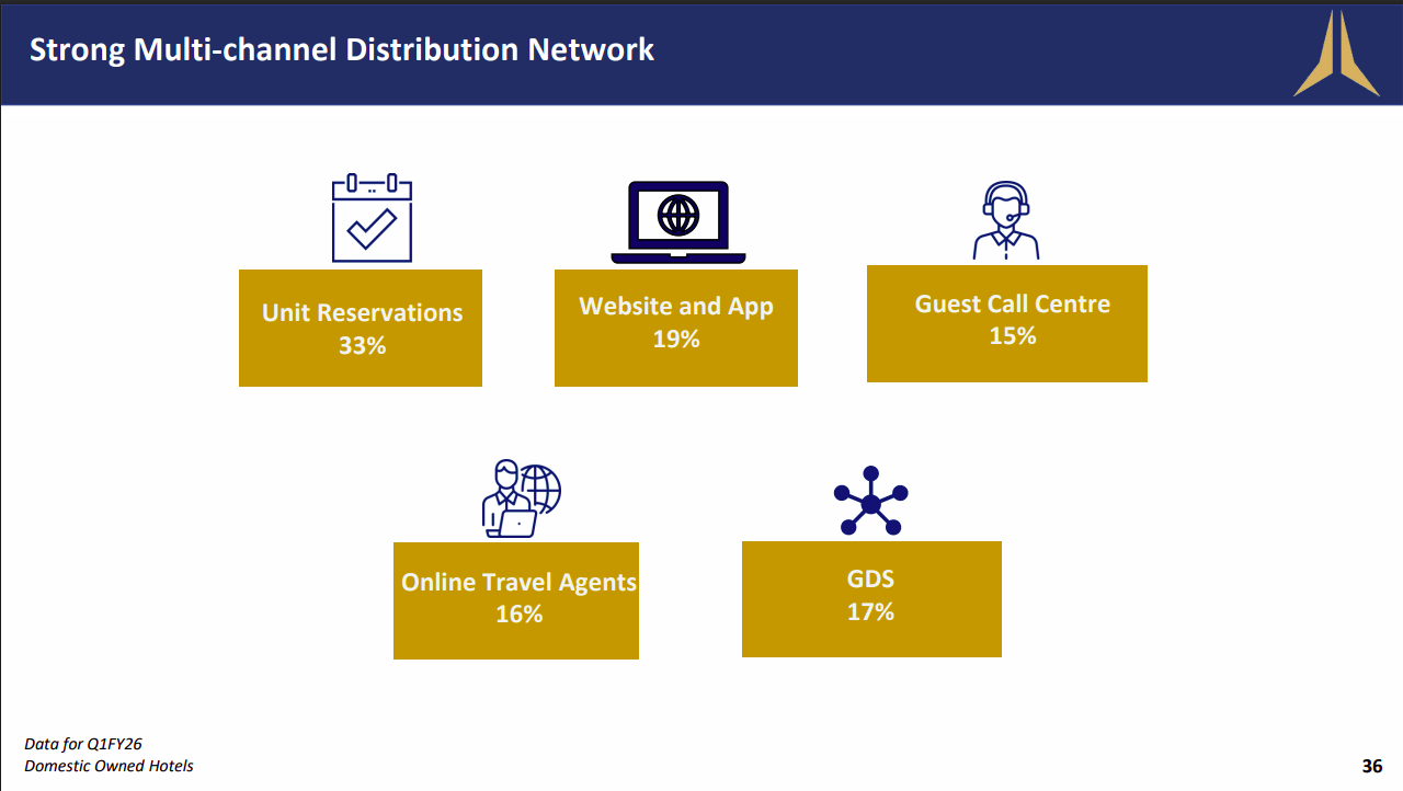 Multi-channel bookings power ITC Hotels — 33% from unit reservations, 19% via website/app, rest split across OTAs, GDS & call centres.