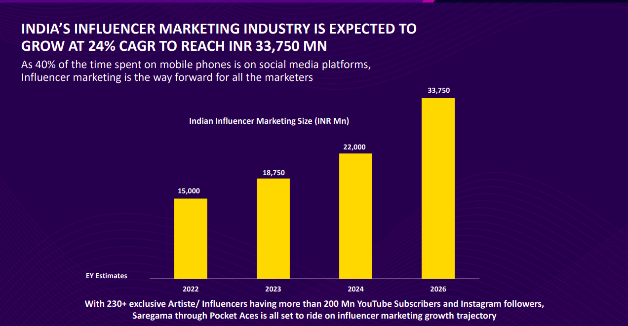India’s influencer marketing industry is projected to grow at 24% CAGR to ₹33,750 Mn by 2026, with Saregama leveraging Pocket Aces’ 230+ influencers and 200Mn+ followers.