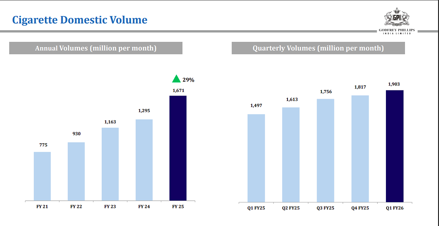 Godfrey Phillips’ cigarette volumes grew 29% YoY in FY25 to 1,671 mn sticks/month, with strong momentum continuing into Q1 FY26 at 1,903 mn.
