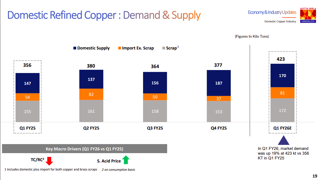 India’s refined copper demand rose 19% YoY in Q1 FY26 to 423 KT (vs 356 KT last year), with higher domestic supply (170 KT) and imports (81 KT).
