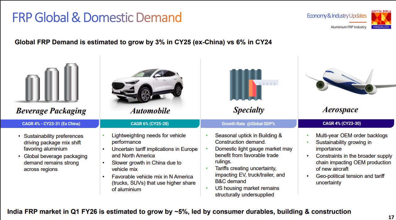 Global FRP demand is projected to grow 3% in CY25 (ex-China), led by beverage packaging (CAGR 4%), autos (6%), specialty, and aerospace (4%), while India’s FRP demand grew ~5% in Q1 FY26.