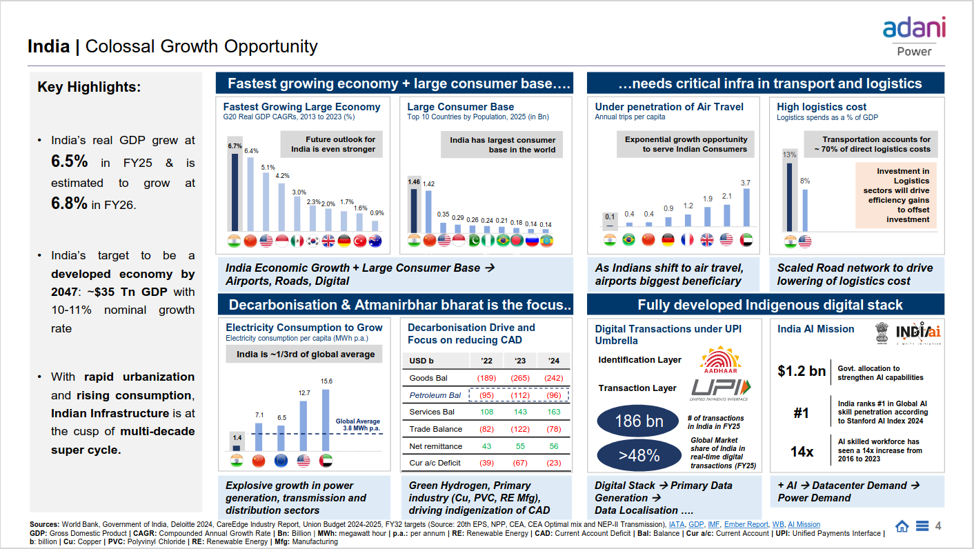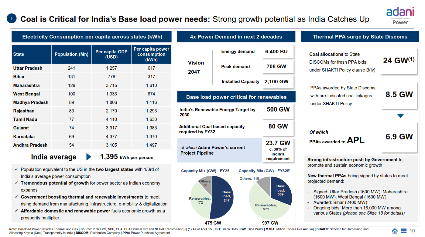 India’s per capita power consumption (1,395 kWh) is far below global levels, highlighting strong growth potential as demand is expected to 4x by 2047. To balance renewable expansion (500 GW by 2030), 80 GW of new coal capacity will be added, with Adani Power’s pipeline at 23.7 GW (~30% of requirement). Thermal PPAs are surging, with states like UP, Maharashtra, and West Bengal signing large contracts, supported by government infrastructure push and affordable domestic power.