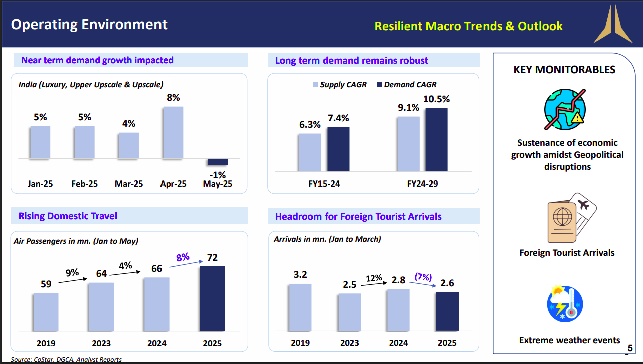 Hospitality demand softens near-term but long-term growth remains strong; domestic travel rising while foreign arrivals lag. Key risks: geopolitics & weather.