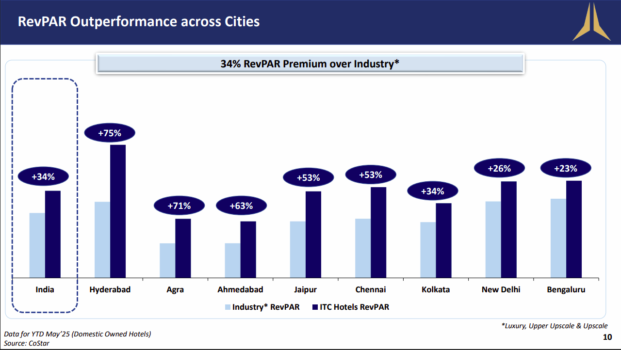 ITC Hotels outpaces peers with 34% RevPAR premium over industry; Hyderabad, Agra & Ahmedabad lead the charge.