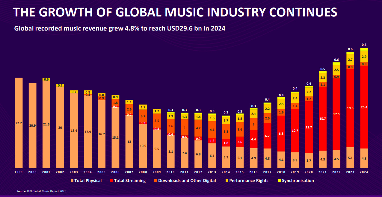 Global recorded music revenue reached $29.6B in 2024 (+4.8%), with streaming now the dominant driver at $20.4B, outpacing physical and digital downloads.