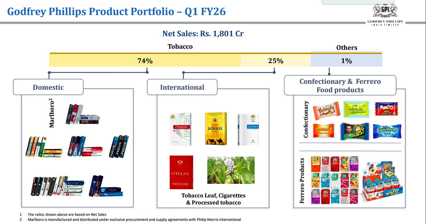 In Q1 FY26, GPI reported ₹1,801 Cr net sales, with tobacco contributing 99% (domestic Marlboro & own brands, plus international leaf & cigarettes), and confectionery & Ferrero products at 1%.