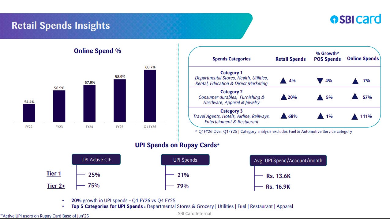 SBI Card’s online spend share reached 60.7% in Q1 FY26 (up from 58.9% in FY25), with fastest growth in travel/entertainment (+111% online) and consumer durables (+57% online). UPI spends on RuPay cards grew 20% QoQ, led by Tier-2+ users (75% share), with average monthly spends at ₹13.6K–₹16.9K per account.
