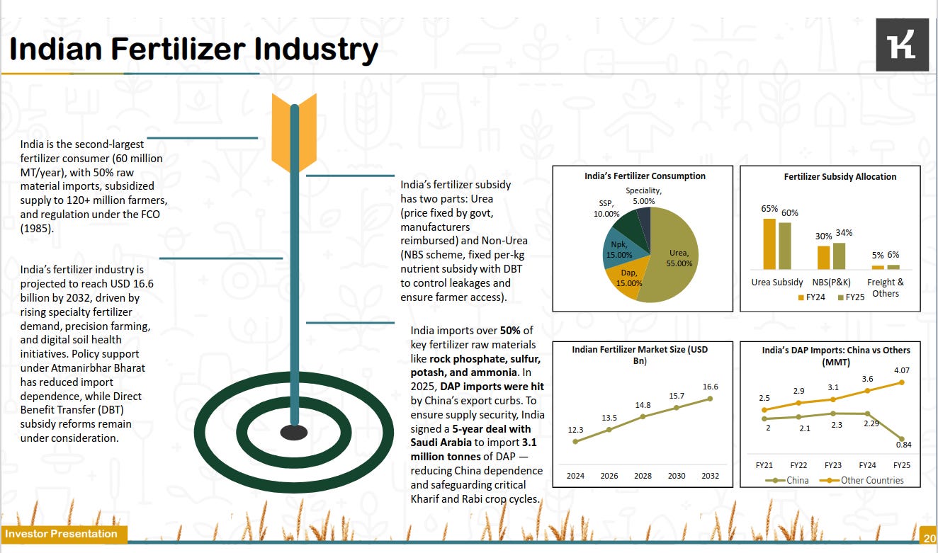 India is the world’s second-largest fertilizer consumer (~60 MT annually), with 50% raw material imports and subsidies reaching 120+ million farmers. The market is projected to grow to $16.6 bn by 2032, supported by specialty fertilizers, precision farming, and DBT reforms. Over 50% of key raw materials are imported, with recent DAP supply challenges leading to a 5-year import deal with Saudi Arabia for 3.1 MT. Urea dominates consumption (55%), while subsidy allocation is shifting more towards non-urea fertilizers.