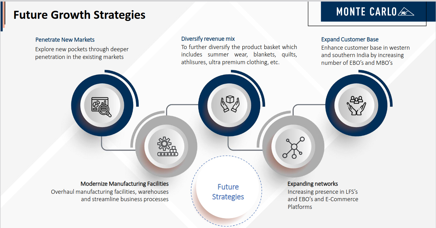 Monte Carlo’s future growth strategies focus on five pillars: penetrating new markets through deeper reach, diversifying the product mix into summer wear, quilts, athleisure, and premium clothing, and expanding its customer base in western and southern India by growing EBOs and MBOs. The company also plans to modernize manufacturing facilities and warehouses to streamline processes, while expanding networks via large format stores, exclusive outlets, and e-commerce platforms.