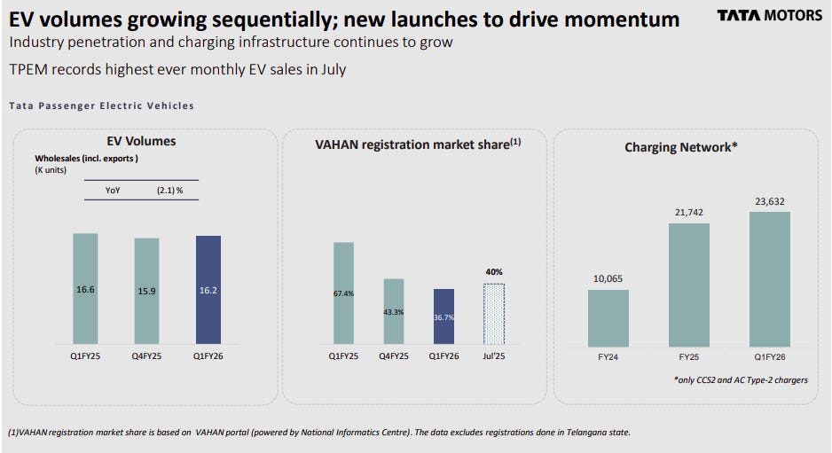 Tata Motors EV sales hit record highs in July; VAHAN share climbs to 40% as charging infra crosses 23K stations.