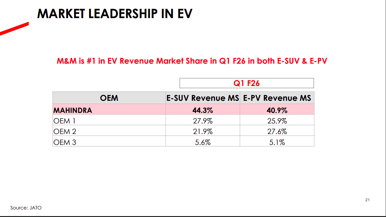 M&M leads EV revenue market share in Q1 FY26 with 44.3% in E-SUVs and 40.9% in E-PVs, well ahead of peers (next OEMs at ~22–28%)